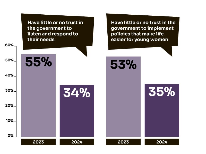 - Almost half (46%) had some trust in the government to implement policies that make life easier for young women.